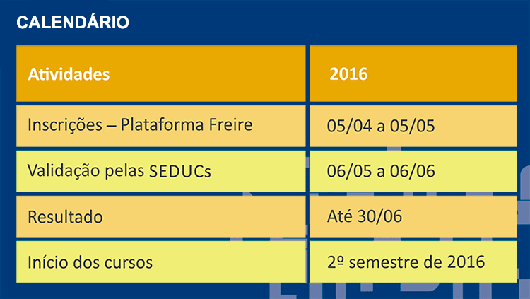 Os professores interessados em complementar sua formação poderão se inscrever nos cursos por meio da Plataforma Freire, entre 5 de abril e 5 de maio. Depois de inscritos, as secretarias estaduais e municipais de educação terão de 6 de maio a 6 de junho para validar as inscrições dos docentes. O resultado será divulgado até 30 de junho e os cursos terão início já no segundo semestre deste ano.