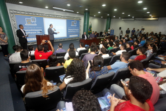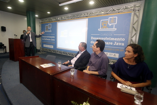 Após a solenidade de abertura, o Gerente de Projetos de Inovação, Eder Furtado, fez uma explanação sobre o curso de Desenvolvimento de Software em Java, que tem como objetivo capacitar os alunos na área de desenvolvimento de sistemas na linguagem de programação Java nos níveis Básico e Intermediário, através de uma metodologia semipresencial, com horários de estudo flexiveis e acompanhamento de tutores durante todo o processo de aprendizagem, através da plataforma de ensino a distância, acessível para pessoas com deficiência física, auditiva e baixa visão, desenvolvida e disponibilizada gratuitamente pela Dell Computadores: A Dell Aceedible Learning.