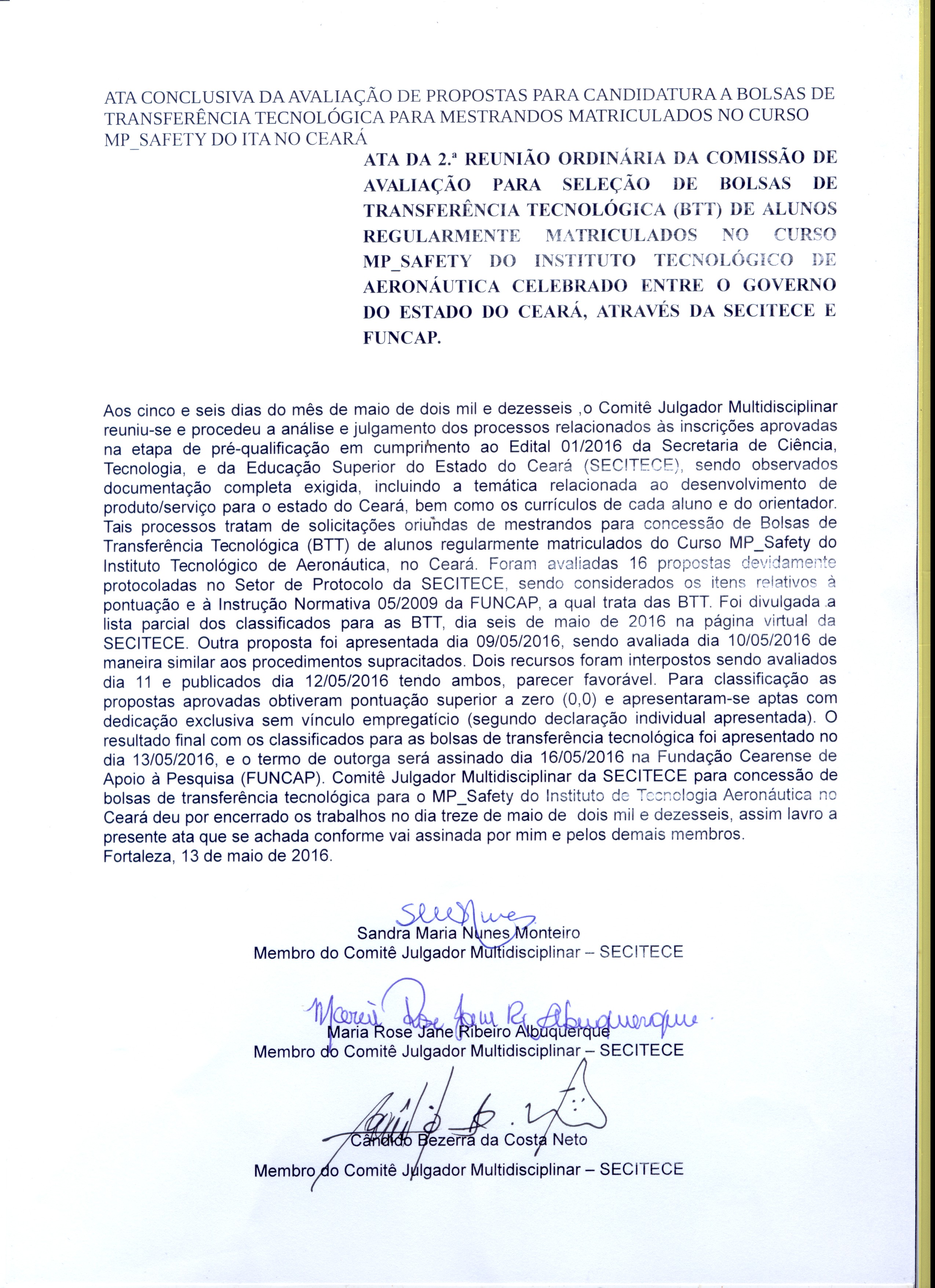 A Secretaria da Ciência, Tecnologia e Educação Superior (Secitece) divulga o resultado final dos aprovados no processo seletivo que concede bolsas aos estudantes do curso de Mestrado Profissional em Segurança de Aviação e Aeronavegabilidade Continuada do Instituto Tecnológico de Aeronáutica – ITA (MP-Safety) no Ceará, segundo edital 001/20126.