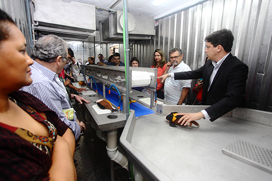 Primeiro equipamento do tipo no Nordeste, o “abatedouro móvel” permite realizar todo o processo de abate do pescado, desde a limpeza do peixe na esteira, paralisia com choque nos tanques, retirada de vísceras, pele e corte.