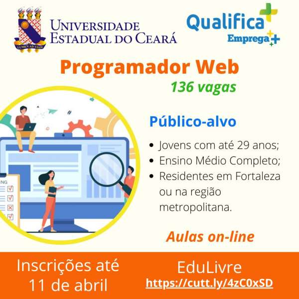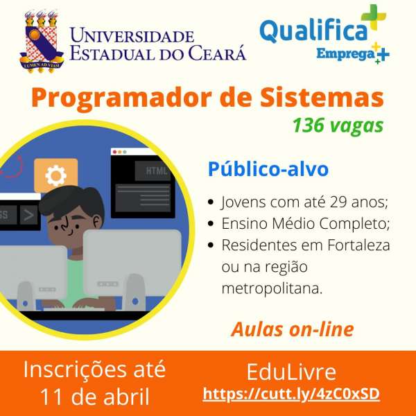 Até 2024, o setor de Tecnologia da Informação e Comunicação (TIC) no Brasil demandará cerca de 420 mil profissionais anualmente, segundo relatório da Associação Brasileira das Empresas de Tecnologia da Informação e Comunicação (Brasscom). Para contribuir no atendimento à demanda do setor, que hoje já enfrenta déficit de mão de obra qualificada, e dar oportunidade de emprego formal aos jovens, os Ministérios da Educação e da Economia lançaram, neste mês, o programa piloto Qualifica Mais-Emprega Mais, que ofertará, por meio da Universidade Estadual do Ceará (Uece), 296 vagas em cursos de qualificação profissional gratuitos para jovens que residem em Fortaleza ou na região metropolitana. Os estudantes que concluírem os cursos serão auxiliados para inserção no mercado de trabalho.
